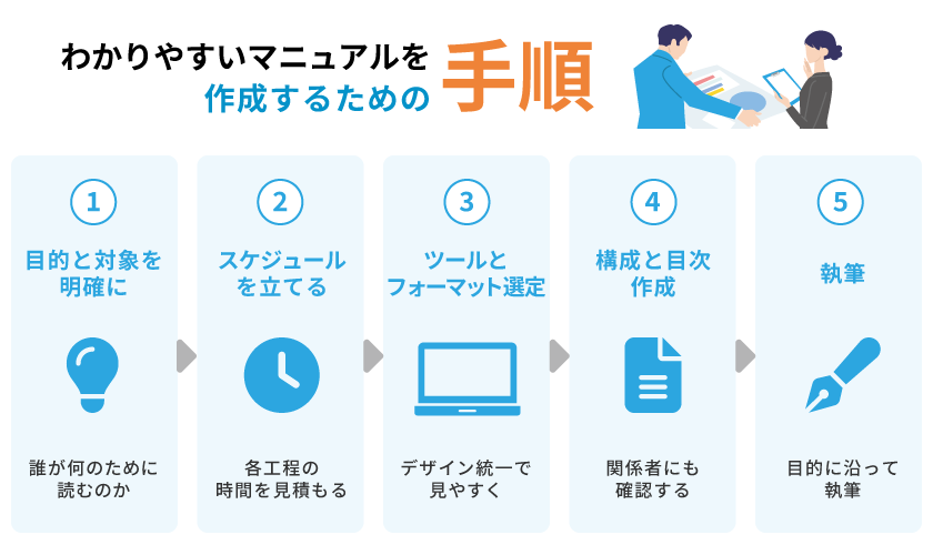 効率的なマニュアル作成の手順は、「1 目的と対象者を明確にする」「2 作成スケジュールを作る」「3 ツールやフォーマットを選定する」「4 マニュアル全体の構成と目次を作る」「5 執筆を進める」です。わかりやすいマニュアルを作成するには、作成者だけでなく、実際の業務を担当するメンバーの協力も欠かせません。