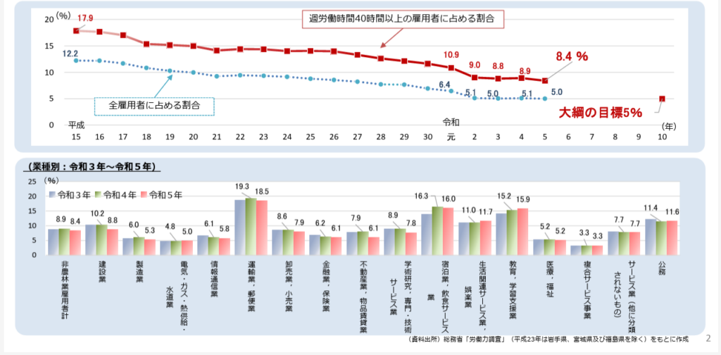 一方で、同調査では2023年時点で「電気・ガス・熱供給・水道業」「生活関連サービス業、娯楽業」「教育、学習支援業」「公務」など一部の業種では、週60時間以上働く雇用者の割合が前年より増加しており、課題が残る分野もあります。