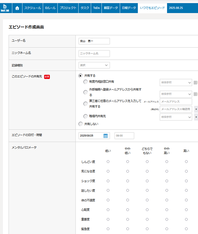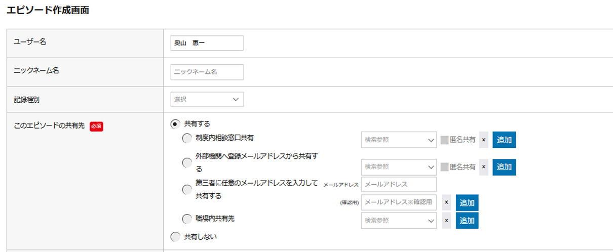 - 状況に応じて、社内外の相談窓口や信頼できる第三者など、共有先を4種類から選択できます。