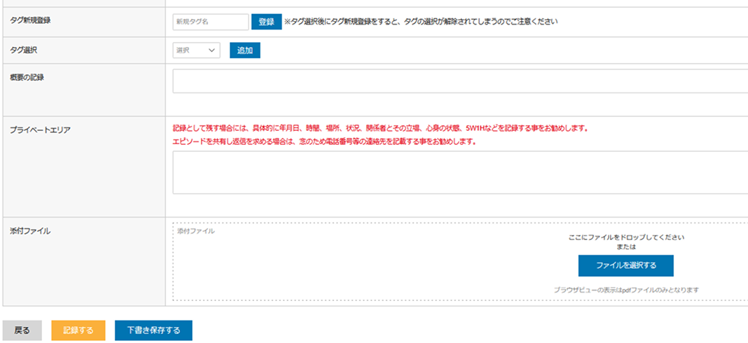 01 いつでも・どこでも事実を記録気づいたことや問題点、ハラスメントの事実などを、いつでも詳細に記録できます。スマートフォンやPCからアクセスし、テキストだけでなくエビデンスとなるファイルも添付可能です。記録されたエビデンスは、万が一の際にあなたを守る楯となります。