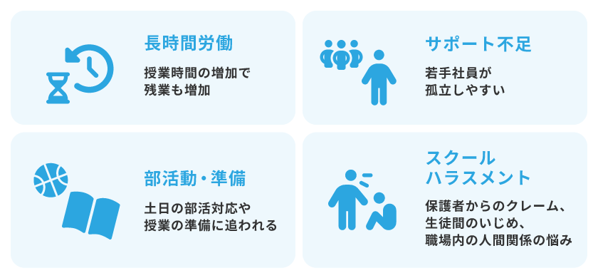 さらに、教材研究や授業準備は業務時間外に行われることも多く、心身の負担増加につながっています。