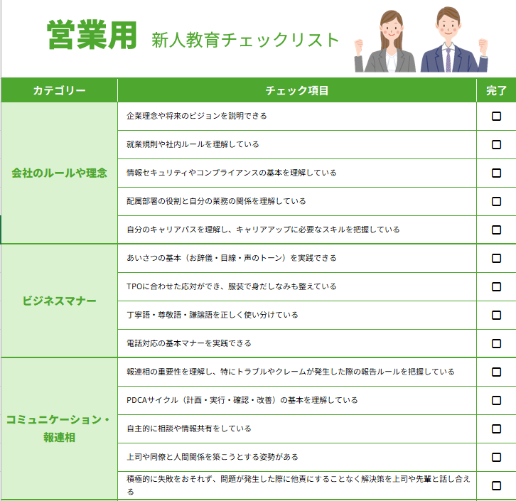 営業新人の立ち上がりが遅い、提案の質が人によってブレる、そんな悩みを”教える内容の標準化”で解消するチェックリストです。